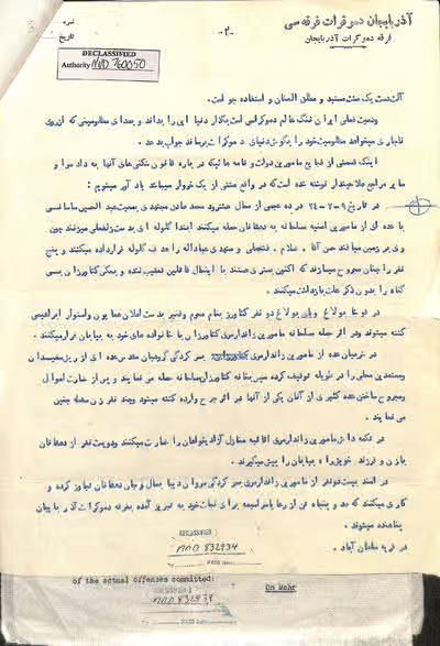 The letter is signed by M. Ravandi. It seems likely that the letter was initially written in Persian and then translated into Turkish, as the Persian version contains references to file numbers. Most probably, this individual is Morteza Ravandi, a first-degree lawyer in Azerbaijan's judiciary and a member of Iran's Tudeh Party (Tudeh Party's Azerbaijan branch) [2], who joined the A.D.P. and participated in the Congress of Azerbaijan [3].